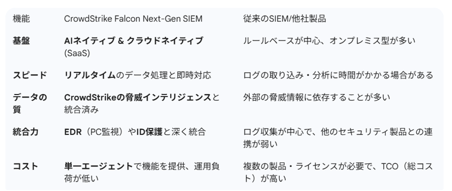 従来のSIEMや他社のサービスと比べたとき、CrowdStrike Falcon Next-Gen SIEMには決定的な優位性があります。