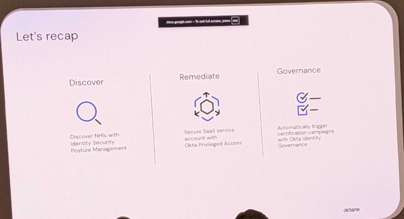 このセッションを通じて、これまで管理対象外となりやすかった非人間ID(NHI)に対し、Oktaが「発見 (Discover)」「保護 (Remediate)」「統制 (Governance)」という明確なライフサイクルでアプローチしていることがよく分かりました。