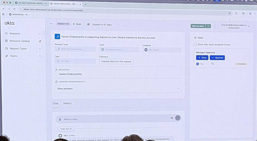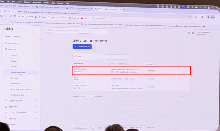 ISPMによってリスクの高い非人間ID(NHI)を「発見」した次のステップは、そのリスクを「保護・修正」することです。セッションでは、Salesforce上で発見されたサービスアカウントを例として、OPA(Okta Privileged Access)を用いた具体的な保護プロセスが実演されました。