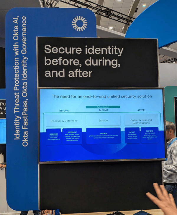 こちらのブースの看板には「Secure identity before, during, and after」と書かれており、これは、IDセキュリティをログイン時だけの点で捉えるのではなく、ユーザーIDの発生から抹消までの全期間にわたって継続的に保護すべきですよといった内容となっています。