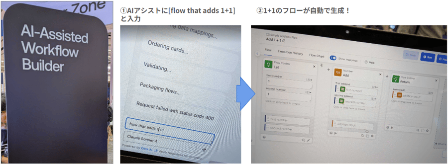 これは、自然言語(プロンプト)で実行したい処理を指示するだけで、AIが自律的にワークフローを構築してくれるというものです。ブースでは開発段階の機能を実際に操作することができました。