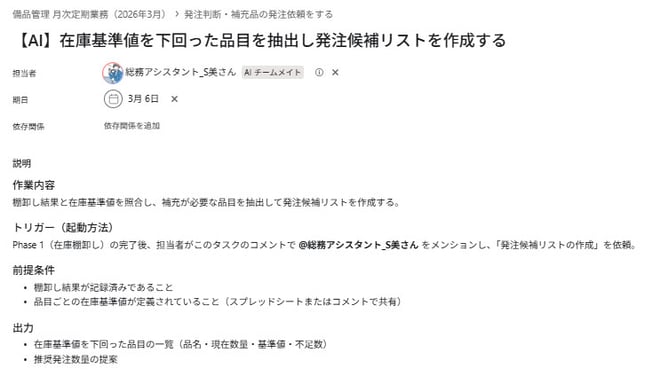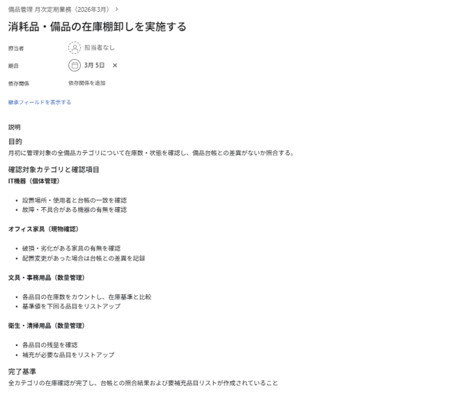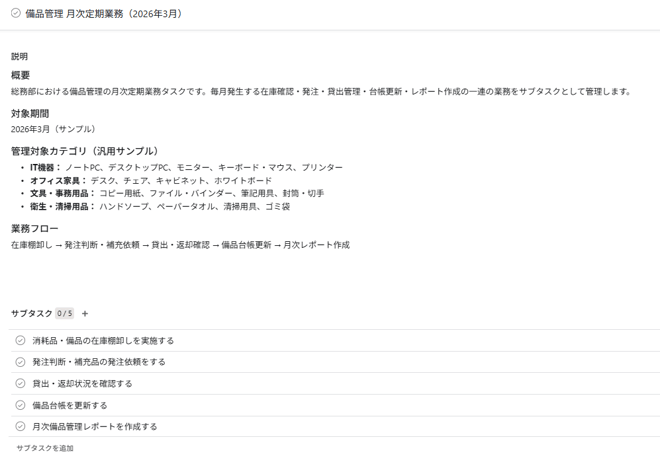 その数秒後には、「備品管理 月次定期業務(2026年3月)」のタスクと、直下に5つのサブタスクが作成されていました。
