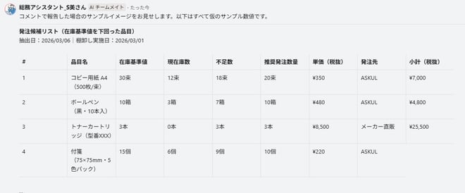 上記はコメント欄で報告してもらう形を希望した場合ですが、Googleドライブに置いた在庫リストと連携すれば、S美さんが基準値を下回った品目を抽出し、発注候補リストをスプレッドシートで報告してくれます。