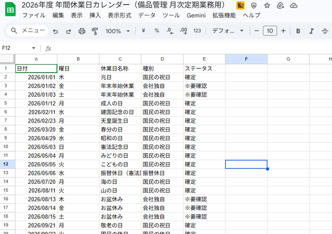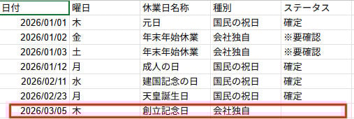 リンクを開くと、祝日データに加えて「※要確認」としてお盆や年末年始の候補日があらかじめ入力されています。