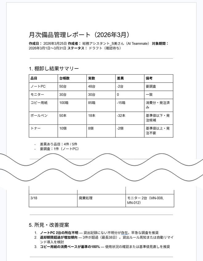 このように、月次レポート作成のタスクをAI チームメイトにアサインしておけば、月末の指定期日に、ドキュメントやシート形式でレポートが自動作成されます。人はまとめられたレポートの「確認」と「承認」を行うだけになり、作業時間の削減はもちろん、人的なミスや報告の遅延を物理的に防ぐことができます。
