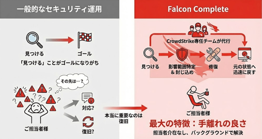 Falcon Completeは、脅威の検知から影響範囲の特定、そして「被害を最小限に抑えるための封じ込めと修復」までCrowdStrikeの専任チームが責任を持って代行します。 企業のご担当者様が介在することなく、バックグラウンドで問題が解決される。この「手離れの良さ」こそが最大の特徴です。