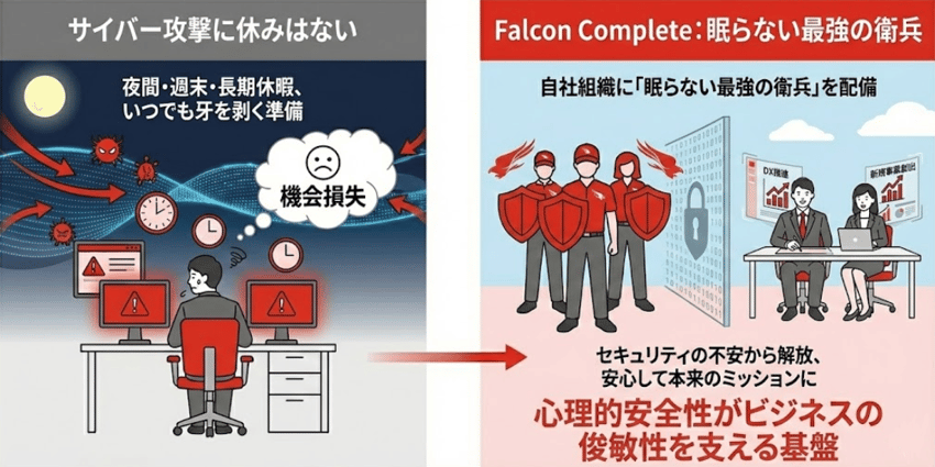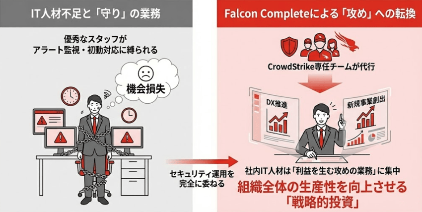 Falcon Completeにセキュリティ運用を完全に委ねることで、社内のIT人材は、DXの推進や新規事業の創出といった「利益を生む攻めの業務」に集中できるようになります。これは、組織全体の生産性を向上させるための「戦略的投資」に他なりません。