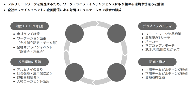 2025年度から、全国900箇所で使えるコワーキングスペースの契約を会社でしたため、その場合には無料で使えます。また、年に2回まで、メンバーの誰かとワーケーションをした場合、会社から1万円の補助がでます。できるだけ社員同士のコミュニケーションを図って欲しいので、誰か1人でも、その年にはじめてランチをする人が混じっていれば、月に1回かで会社でランチを負担しています。それ以外にも、年に1回の全社員ワーケーションや、全社員合宿、レクリエーションや懇親会での集まりの際には、もちろん、会社で負担しています。言うまでもないですが、出張や業務での移動は、もちろん会社負担です。