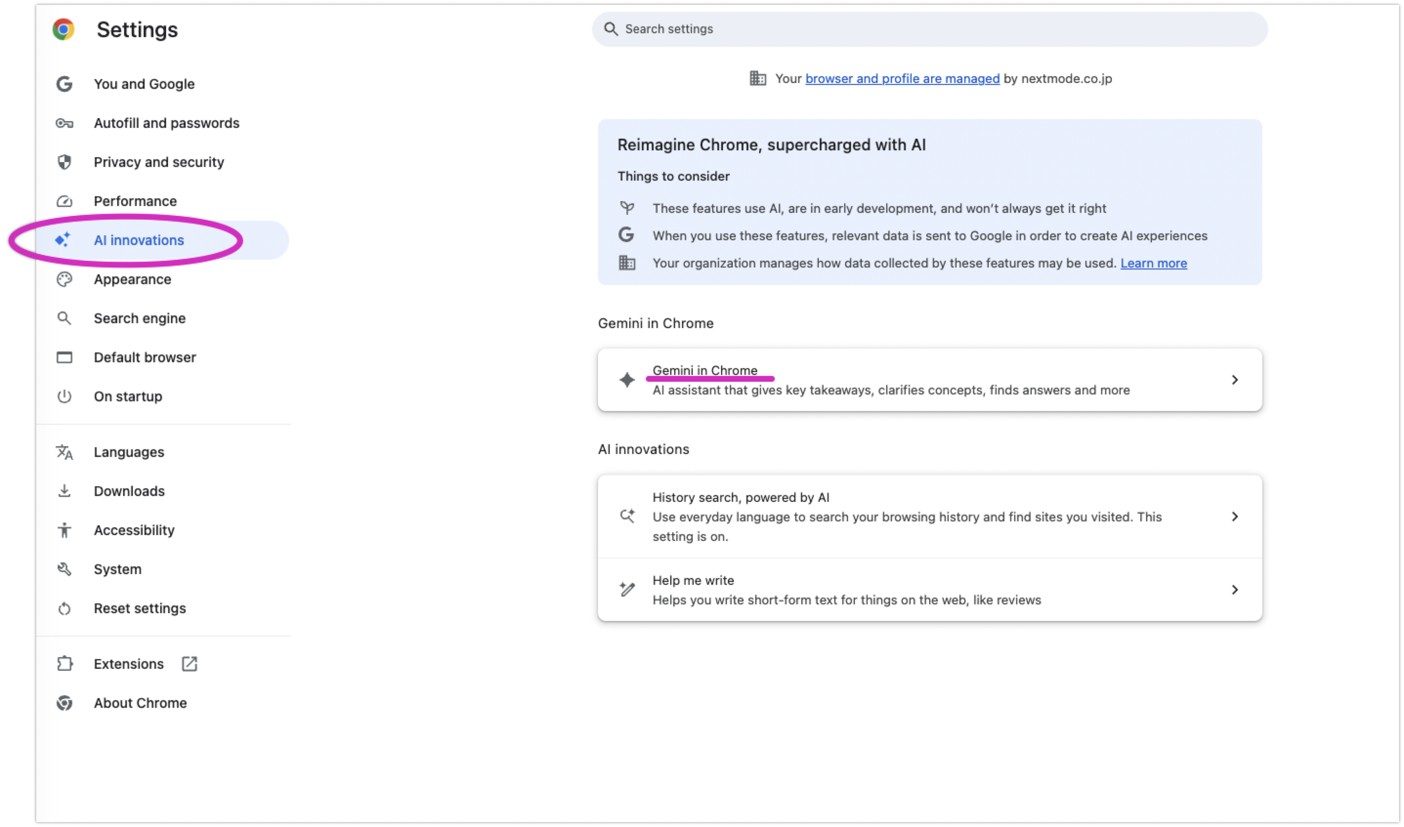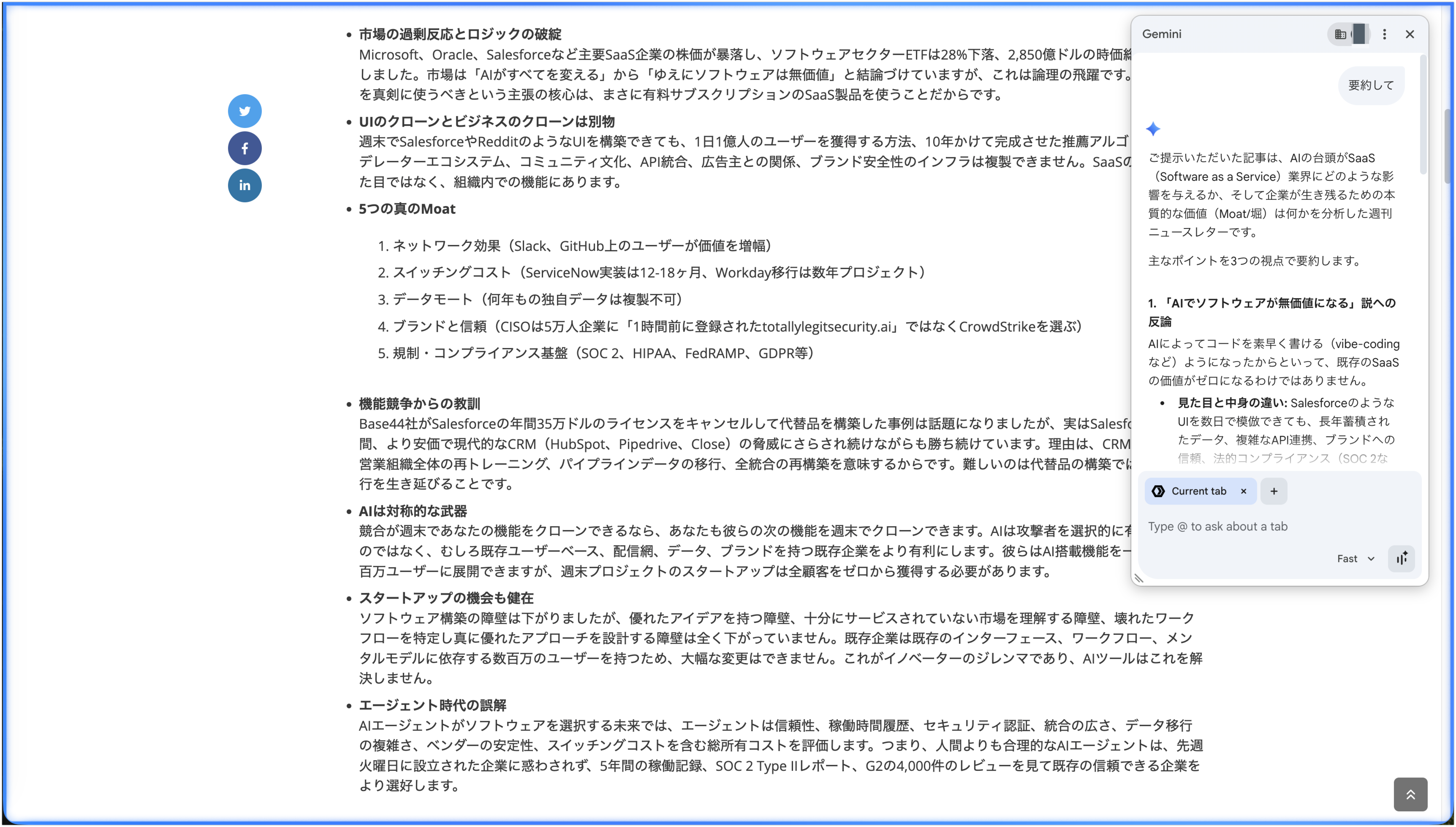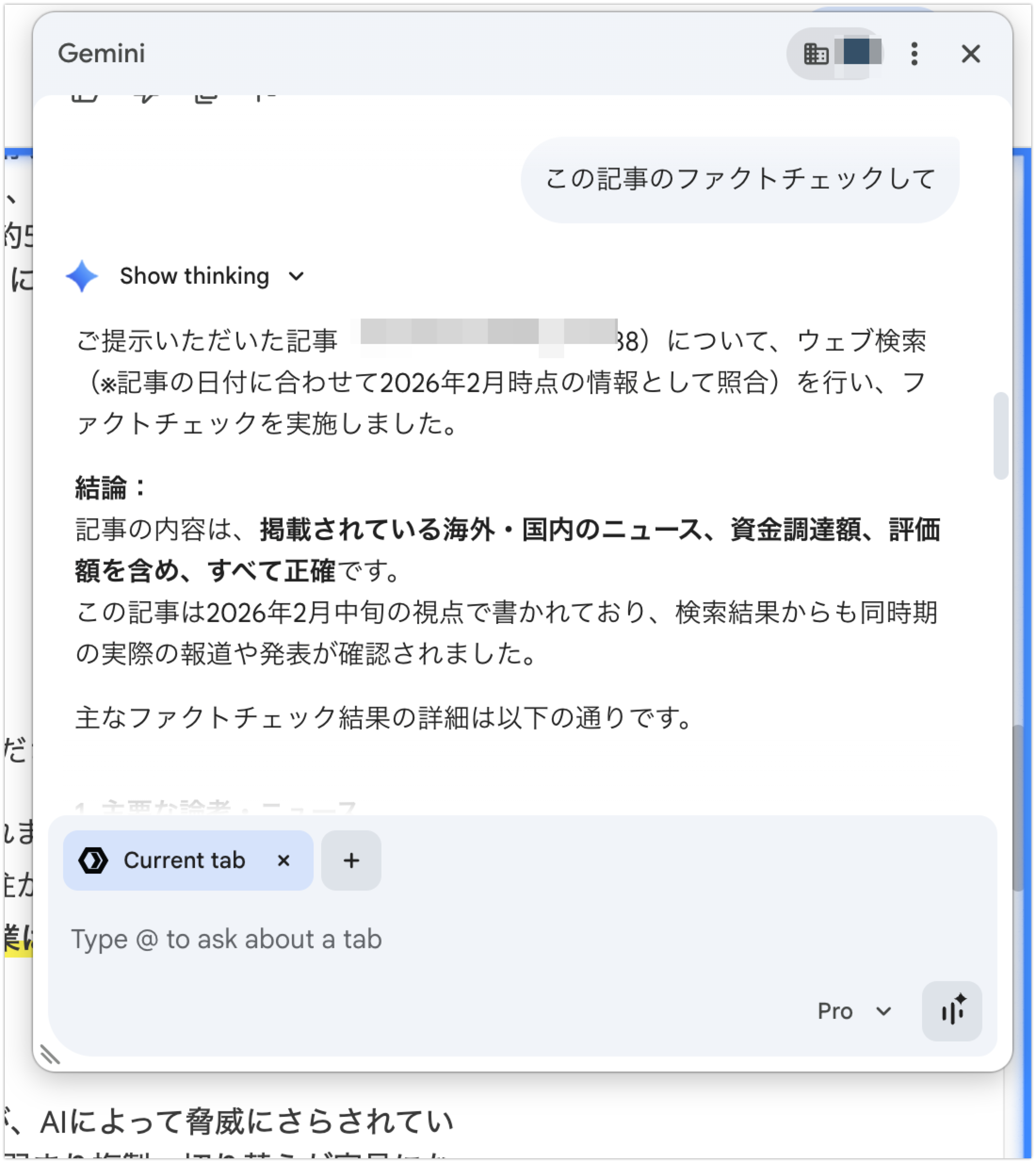 Gemini in Chromeの詳細な使い方については、その他のAI組込み型ブラウザと変わらないためほぼほぼ省略させていただきますが、記事の要約だったり、「これ、本当かな〜」「これ、AIが書いてるのかな〜」みたいな追加の調べものや、記事中の画像に対しても追加質問ができたりするので、仕事でもプライベートでも間違いなく便利な機能です。