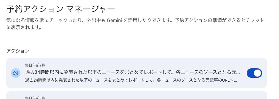 Ask Geminiでやっている、ほら、毎日スケジューリングしているタスクありますよね?そう予約アクションマネージャー。これもマージしましょ。