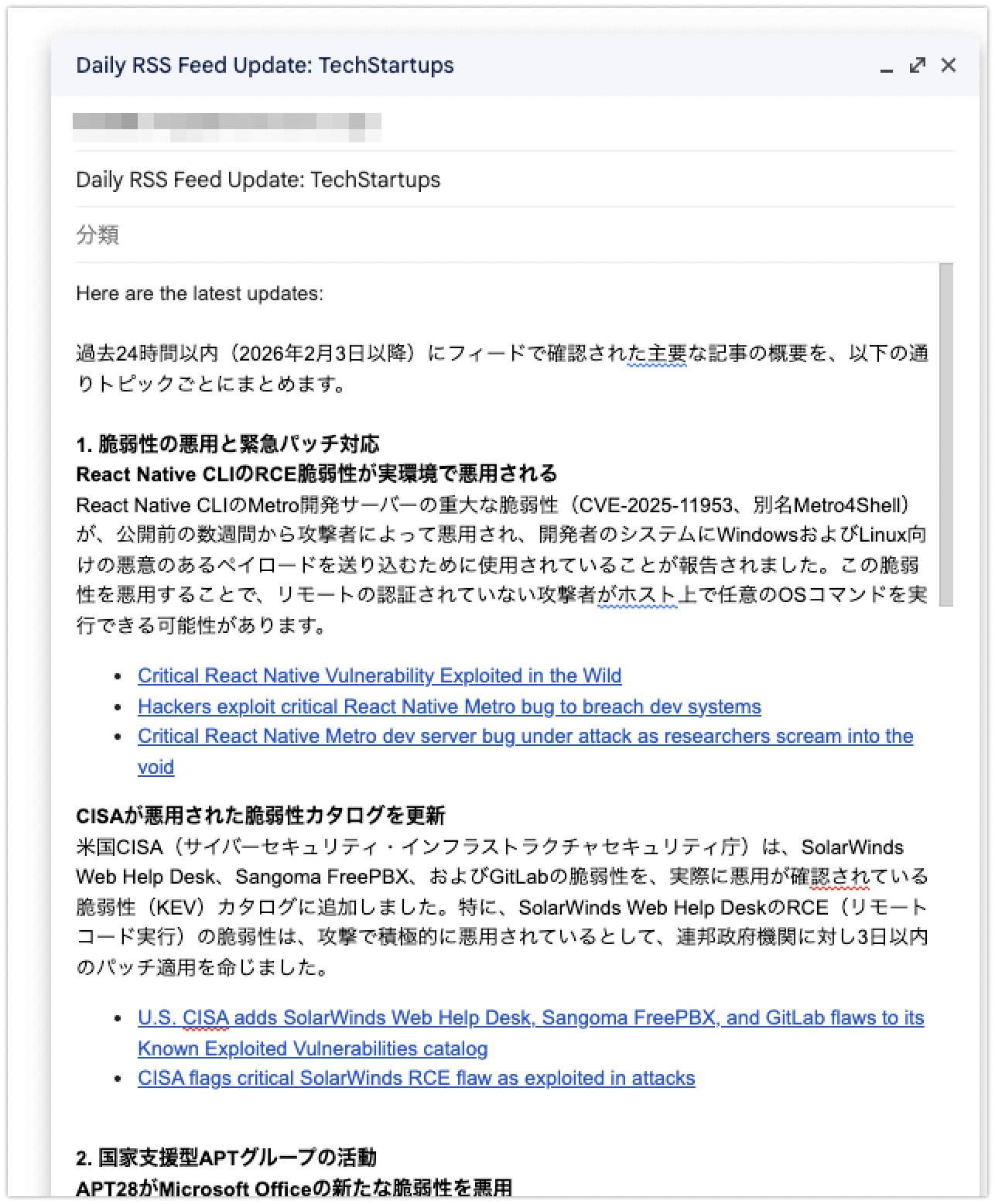 私は毎朝、毎晩、毎週末、複数のニュースサイトから情報を引っ張ってきて、もっと言うと、絶対に見逃すな!っていうニュースサイトはSlackに/feedで購読して、US圏からもニュースが来るので現地の日中帯に通知来まして、いくつかのGenAIもスケジュール通知させて、あちらあこちらから通知が飛んでくるものをキャッチアップしているのですが、前述の非同期ボインボインに疲れてしまったので、リアルタイムコミュニケーションツールのような、あちらのタイミングで無造作に、小出しに飛んでくる通知ではなく、自分のタイミングで、上から順番にタスクを捌けるようなツールに置き換えたいと思います。