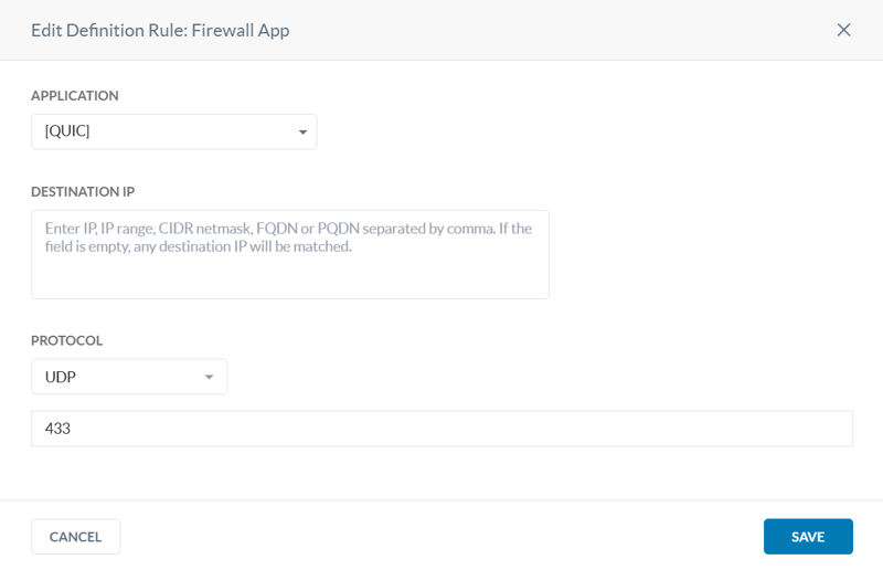 - 管理コンソール > Settings > Security Cloud Platfom > App Definition > [CLOUD & FIREWALL APPS]タブにて [NEW APP DEFINITION] から[Firewall App]を選択し以下のような定義を作成