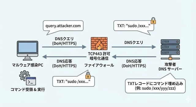マルウェアはまず端末に潜伏し、DoHで外部の攻撃者DNSへ問い合わせます。TXTレコードで受け取った小さな断片を端末側で復元し、次の行動(追加のマルウェア取得や暗号鍵の取得)を決定します。単純なファイアーウォールでは「普通のWeb通信」であるHTTPS(TCP433)にみえるため許可せざるを得ず、検知・ブロックする手立てがありません。