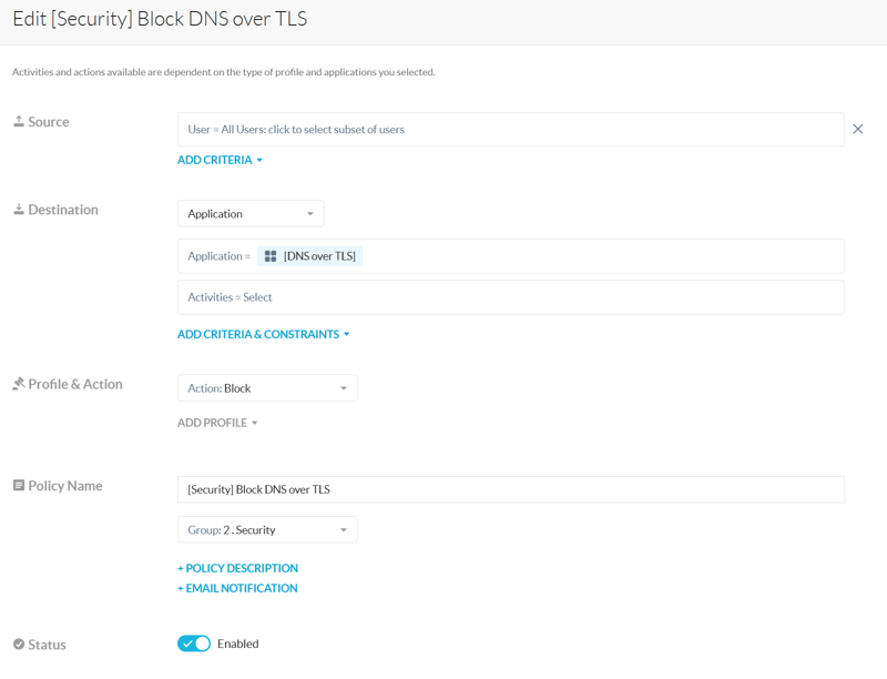 Application = のところで先ほど定義した [DNS over TLS] を選択