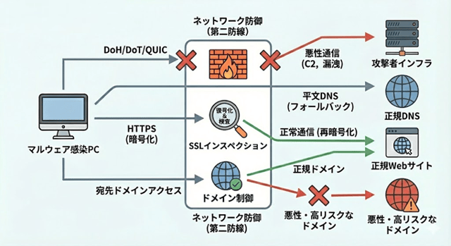 エンドポイント監視を補完する形で、通信の可視化・制御を担うネットワーク防御(第二防線)が対策として必要となります。