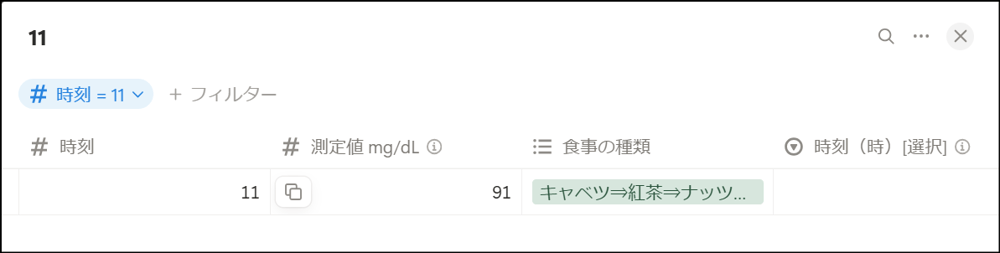 このデータを可視化している場合、グラフ軸の「11時」の91 mg/dLをクリックするだけで、以下のような記録をリアルタイムで即座に確認できます。