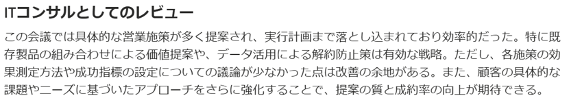 ある打ち合わせのITコンサルのプロからのレビューはこちら。(的確なアドバイス助かります!)