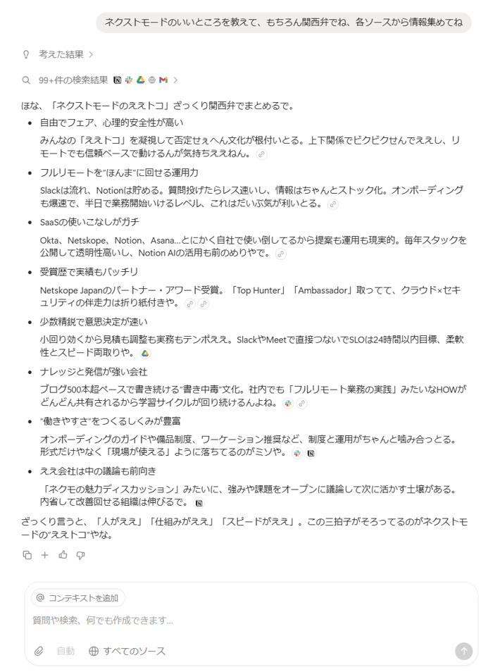 「あの件、どうなってたっけ?」とNotionに聞いたら、「チャットツールの〇〇チャンネルで××さんがこう発言していて、共有ドライブのこの資料に詳細があります」って、Notionの外にある情報まで全部まとめて回答してくるんです。 2024年後半からコネクター機能が強化されたとは聞いてましたが、まさかここまでとは。Notionが「情報のブラックホール」から「司令塔」になってました。
