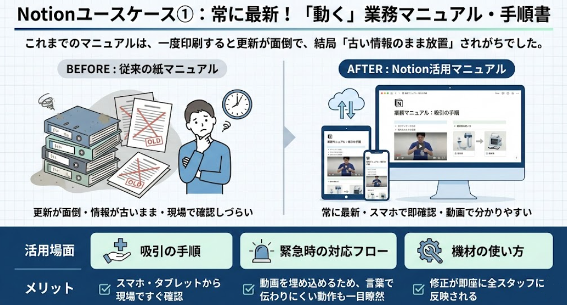 - 活用場面:吸引の手順、緊急時の対応フロー、機材の使い方などをページ化。