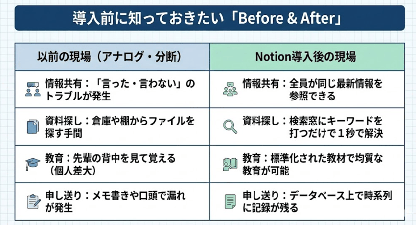 Notionを導入することで、バラバラだった情報を一つの「デジタルナレッジベース」に集約し、必要な時に必要な情報へ即時にアクセスできる環境を作ることができます。